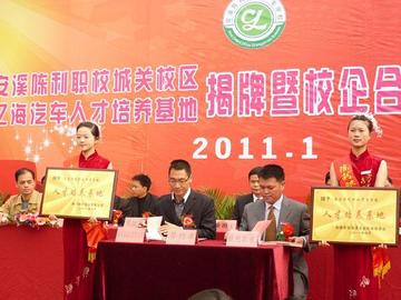 2011年1月5日,安溪陈利职业中专学校城关校区和亿海汽车人才培养基地揭牌暨校企合作签约仪式在原海联职专校址(凤城镇吾都)举行。县委副书记黄国富、副县长龚培毓[yù]出席揭牌暨校企合作签约仪式。在揭牌暨校企合作签约仪式上,安溪陈利职业中专学校分别与亿海国际汽车城、清水岩温泉度假山庄开发有限公司、4A级清水岩风景旅游区签订双方联合办学协议书,同时,该校还分别被亿海国际汽车城、清水岩温泉度假山庄开发有限公司、4A级清水岩风景旅游区授予“人才培训基地”。在此次校企联合办学中,陈利职校城关校区将开办汽车维修、装潢、销售和景区服务和管理专业,并于2011年春季开始面向全县招收初中毕业生,毕业后由亿海国际汽车城、清水岩温泉度假山庄开发有限公司、4A级清水岩风景旅游区择优聘用。 此次校企联合办学,不仅盘活了双方教育资源及社会资源,加快了我县中等职业教育的改革步伐、加大了技能型人才的培养力度,而且对今后校企双方共同把握人才市场需求,为学生提供更多就业机会,推动我县职业教育的“开门教学”,全面提高学生的就业水平与发展能力,进一步促进我县职业教育事业的良性发展,都将产生积极而深远的意义。