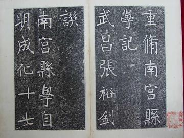 全称《重修南宫县学碑》,也称《重修文庙碑记》。位于河北省南宫市南宫中学院内(原南宫县县政府院内)。该碑原为南宫县文庙之物,坐落在文庙泮池之侧,故称南宫碑。因碑额题有篆文“重修文庙碑记”,故也叫重修文庙碑记。张裕钊篆文并书丹。 龟趺[fū]。此碑系清末著名散文家、书法家张裕钊撰文并书丹,字体结构里圆外方,方中带圆,颇有风神;圆中见方,内藏筋骨,使每一个字都显得既充实而又有余韵,堪称“柔峻相间,融而化之”,曾被誉为“在近代书坛上别开生面,独创一格”的“南宫碑体”。称为“文字双美”,刻镌兼优的艺术珍品。此碑颇得金石书法爱好者的青睐,其拓本解放前在京、津书肆就多有出售,风行海内外。