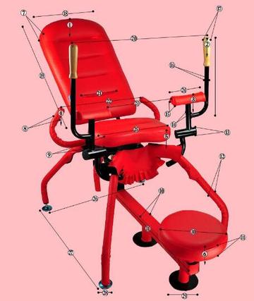 由主椅及副椅二部分组成,副椅靠背可以收折,椅面能左右旋转、高低进退可调,具有诸多功能及可操作技巧。主椅靠背斜度可调,“扶手”有可以伸延收叠的挎脚架。其优点是姿势体位众多,省力、轻巧、延时,使男女双方容易达到高潮,因为夫妻椅设计的重要内涵就是丰富性乐趣,使人体的姿势体位能够得到最好的延伸发挥,这些是传统床面所无法做到的,或者十分勉强才能做到的。夫妻椅并非单独追求姿势的多少,而是跨越姿势的极限,着重讲究技巧的发挥及男女双方的造势,以谐为本,使同样的伴侣能在同一姿势的情况下,运用不同的技巧获得持久的享受。