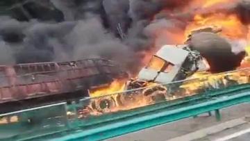 追尾肇事,油罐车车头起火引发罐车爆炸燃烧。
