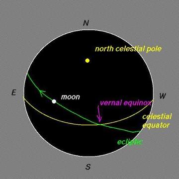 月球的公转平面和地球的公转平面不重合,有一个大约5度9分的夹角。 所以并不是每个农历月都会发生日食和月食。只有当月球和太阳、地球位于同一直线上,且此时月球位于两个平面的交点附近时才会发生日食或月食。因为每次日食时月球和两个平面交点的距离不固定,而且地球自转造成的角度也不固定,因此日食带在地球上的地点不固定。月球绕地球公转的轨道在天球上的投影。它是天球上的一个大圆,与黄道相交于两点。月球在白道上从黄道以南运动到黄道以北的那个交点称为升交点,与此相对的另一交点称为降交点。白道和黄道的交角在4°57′~5°19′之间变化,平均值约为5°9′,变化周期约为173天。由于太阳对月球的引力,两个交点的连线(即交点线)沿着黄道与月球运行相反的方向向西移动,结果使月球绕行一周后并不返回原来的位置。交点线西移的现象称为交点退行。交点线每年移动19°21′,约18.6年完成一周,这就引起月球的赤纬变化。当升交点与春分点(见分至点)重合时,黄道位于白道与赤道之间,白道与赤道的交角为黄赤交角与黄白交角之和;当降交点与春分点重合时,白道位于赤道与黄道之间,白道与赤道的交角为黄赤交角与黄白交角之差。