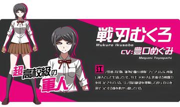 战刃骸(いくさば むくろ、Ikusaba Mukuro),游戏《弹丸论破:希望的学园和绝望高中生》及其衍生作品中的女性角色,由丰口惠美配音。超高校级的军人,是“超高校级的平面模特(绝望)”江之岛盾子的姐姐,是佣兵团“芬里厄狼”的成员,深深的爱着自己的妹妹江之岛盾子。[1]在原著中,战刃骸受到江之岛盾子设计欺骗,在伪装成妹妹样子与大家互动时被许多长枪(冈格尼尔之枪)贯穿身体致死。[2] 人物介绍