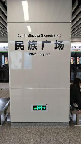 民族广场站(英文:MINZU Square Station,壮文:Camh Minzcuz Gvangjcangz)位于南宁市民族大道与古城路口交汇处,是与南宁市的中心广场——民族广场最为靠近的车站,附近有梦之岛百货、广西壮族自治区博物馆、广西壮族自治区图书馆等,同时临近的东葛路、古城路、星湖路等亦有成片的商业办公楼与住宅小区,车站周边的商业发达,文化休闲氛围浓厚,人流密集,因此本站全天均有较多的客流量。 基本信息