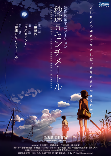 《秒速5厘米》(秒速5センチメートル),由新海诚执导,水桥研二、近藤好美、花村怜美、尾上绫华等参与配音的爱情题材动画电影。该影片于2007年3月3日在日本上映,于2007年8月31日在中国台湾上映,同年9月20日于中国香港上映,后续也在韩国、美国、加拿大等国家和地区放映。[4][3] 《秒速5厘米》漫画于2010年由讲谈社开始出版发行,改编的影片讲述的是远野贵树和筱原明里的爱情故事,影片以一个少年为轴心,展开了三个独立但彼此关联的短篇故事,时代背景是20世纪90年代至21世纪初期的日本,通过少年的人生轨迹也展现了东京及其他地区的变迁。影片的结构采取三个彼此关联的小故事,串成了一个整体,《樱花抄》《宇航员》和《秒速 5 厘米》,第一章和第三章是正面描述,第二话则是通过暗恋贵树的澄田花苗的眼光展开。[4][5][6] 《秒速五厘米》于2007年3月3日在日本东京涩谷CINEMA RISE正式上映,连续两周蝉联小型戏院票房排行第一名;该片在2007年亚洲太平洋电影节获得最佳长篇动画电影奖;2008年在意大利未来电影节获得Lancia Platinum Grand Prize。[7] 影片剧情
