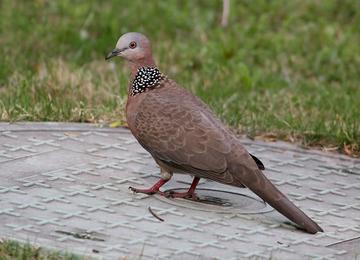 珠颈斑鸠(学名:Spilopelia chinensis),又名花斑鸠、珍珠鸠、花脖斑鸠、鸪鹪,[17]属于鸽形目鸠鸽科副斑鸠属鸟类。体长27~34厘米,体重120~205克。上体大都呈褐色,下体呈粉红色。头呈鸽灰色,头侧以下至腹部呈粉红色;后颈有一大块黑色领斑,其上布满白色或黄白色珠状细小斑点;外侧尾羽呈黑色,具宽阔的白色端斑;翼缘呈蓝灰色,飞羽呈深褐色;虹膜、嘴深角、爪角呈褐色,脚和趾呈紫红色。[7][5][6] 珠颈斑鸠的栖息地以稀疏树木生长的草地、平原、低山丘陵和郊野农田地带为主。它们广泛分布于亚洲南部,从印度、斯里兰卡东部到中国南部、东南亚等地,后被引进到美国洛杉矶、澳大利亚墨尔本(1860年)、印度尼西亚、新西兰等国家和地区。[18]主要以植物种子为食,特别是农作物种子,比如油菜子、麦粒、稻谷等。[6][8][11][14] 珠颈斑鸠在《世界自然保护联盟(IUCN)濒危物种红色名录》(2016年)和《中国生物多样性红色名录-脊椎动物》(2021年)中均被列为无危(LC)。[9][10]
