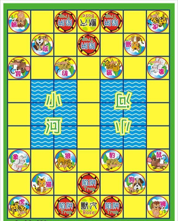 斗兽棋(Animal Chess),别名The Jungle Game,一种双人对弈棋类游戏,双方各有8枚不同动物棋子,分别为象、狮、虎、豹、狼、狗、猫、鼠,棋子有大小之分,循环克制,最终的目标是进入对方阵营的兽穴或对吃光对手所有棋子。游戏使用横九竖七的棋盘,中间设有河流与陷阱,鼠在河中时陆地动物无法攻击。[1][2] 斗兽棋起源于大约二十世纪左右的中国,并被普遍认为玩法源于中国象棋。[1]