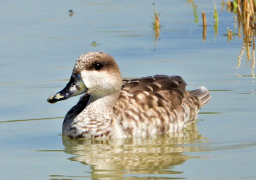 云石斑鸭(学名:Marmaronetta angustirostris),是鸭科云石斑鸭属鸟类[2]。云石斑鸭身长38~48厘米,体重240~600克,雌雄相似[3]。整体呈灰褐色,身体上有乳褐色斑点[4]。头淡灰色,头后部具有短的悬垂羽冠,雄性更为突出[3],雌性的羽冠较短[5]。头顶和羽冠都具细的褐色横斑,并经过眼周向后枕延伸,颜色逐渐变淡[3]。 云石斑鸭主要分布于非洲、欧洲和亚洲[1],例如摩洛哥、阿富汗、巴基斯坦、印度、中国等[4];其中,在中国常见于新疆维吾尔自治区西部[2][6]。栖息海拔高度上限为1500米[4]。常栖息于富有挺水植被的浅水和岸边植物的淡水或咸水湖泊、小的水库和流速平缓的河流中,也出现于鱼塘和沿海沼泽地带[3]。 截至2022年,云石斑鸭的种群数量趋于减少[4]。2000年8月1日,云石斑鸭被列入中国国家林业和草原局发布的《国家保护的有益的或者有重要经济、科学研究价值的陆生野生动物名录》[7]。2021年2月1日,云石斑鸭被列入中国《国家重点保护野生动物名录》国家二级保护野生动物[8]。2022年8月4日,云石斑鸭被列入《世界自然保护联盟(IUCN)濒危物种红色名录》ver3.1,将其定级为近危(NT)物种[4]。 命名与分类