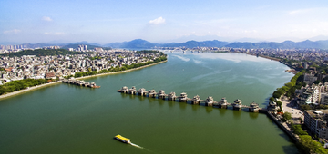 韩江(英文名:Hanjiang River[1])古称员水、恶溪、鳄溪等[2],位于粤东、闽西南,经纬度范围在东经115°13′-117°09′、北纬23°17′-26°05′之间,流域范围包括广东、福建、江西三省部分区域,干流长470千米,流域面积30112平方千米[4],多年平均径流248.9亿立方米[7],是广东省除珠江流域以外的第二大流域[4],也是广东省重点保护的饮用水源河流之一[9]。韩江发源于广东省紫金县的七星岽[dōng],在三河坝与汀江汇合,经潮州市进入韩江三角洲,分北、东、西溪出南海[4]。 韩江流域属于亚热带季风气候,高温湿热,暴雨频繁[5][4]。流域多年平均气温为20.8℃,多年平均降雨量约为1600毫米,主要集中在4-9月[10]。流域是以多字型构造为特点,高程在20米-1500米之间[4]。地貌类型以山地和丘陵为主,占总面积的90%以上[10]。流域还分布有国家Ⅰ级重点保护物种鼋[yuán][11]、中华穿山甲和“植物活化石”桫椤等珍稀动植物[12]。 秦始皇于三十三年(公元前214年)在该流域设置南海郡,后历经变迁,形成了现在的潮州市[13]。韩江是粤东地区最主要的水上运输通道[14]和海上丝绸之路的重要发源地[15]。此外,韩江中上游的梅州具有山水人文优势[15],中下游的潮州是国家历史文化名城[16],有韩文公祠[17]、广济桥[18]等9处全国重点文物保护单位[19]。截至2023年,韩江流域已修建5个跨区域引调水工程、4座大型水库[1],以及高陂、东山和潮州3个水利枢纽,为韩江中下游供水安全提供保障[20]。 2017年,韩江入选年度全国10条“最美家乡河”;2019年,韩江潮州段入选全国17个示范河湖建设名单,是广东唯一入选的河湖;2020年底,韩江潮州段全国示范河湖建设高分通过国家验收[21][22]。韩江在2020年的国家和省级考核中断面水质达标率100%、饮用水源水质达标率100%、水质优良比例100%。韩江潮州段常年稳定保持Ⅱ类以上水质[22]。 命名