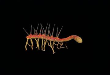 怪诞虫属(学名:Hallucigenia),叶足动物门的一种古生物,生存年代大约在5.1亿年以前,生存环境为海洋环境。[11][1]怪诞虫属下共有3个种,即具刺怪诞虫(Hallucigenia sparsa)、强状怪诞虫(Hallucigenia fortis)、洪玫怪诞虫(Hallucigenia hongmeia)。[5][8] 怪诞虫属下物种的体长约2.5厘米。[12]其身体为管状,背上长有双排长刺,头部较小,一个单眼,一个嘴,有环形齿,前肠有板覆盖,脖子较细。[9]具刺怪诞虫头部呈长锥状,强状怪诞虫头部为亚球形,洪玫怪诞虫的头部形状暂时未知。[7][5][8]
