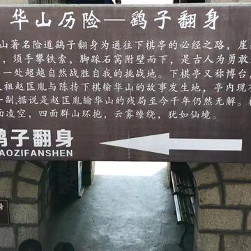 鹞子翻身位于陕西省渭南市华阴市玉泉路南段华山风景名胜区内,在华山东峰,是通往下棋亭的必由之路,[2][1]是华山著名的险道之一。[3] 鹞子翻身,崖高十余丈,手攀铁索,脚踩石窝,附壁而下,两边都是万丈悬崖,中途又须侧足转身,用脚尖探寻石窝,交替而下,其中几步就像鹰鹞一般左右翻转身体才可通过,故称鹞子翻身,为华山第二天险。[2][4] 命名