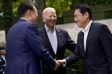 当地时间2023年8月18日,美国总统拜登与日本首相岸田文雄、韩国总统尹锡悦在美国总统庄园戴维营举行会晤,称向三方军事和经济伙伴关系迈出重要一步。[1]戴维营峰会上通过两份“成果文件”:《戴维营原则》和《戴维营精神》,明确三边合作的基本框架。三人承诺以后每年举行至少一次三边峰会;声称要在“危机时刻”迅速相互协商,协调应对影响共同利益的地区挑战、挑衅和威胁;同意每年举行三边军事演训,并在2023年年底前分享有关朝鲜导弹发射的实时信息。[2]