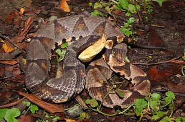 尖吻蝮[fù](拉丁学名:Deinagkistrodon acutus),别名百步蛇、五步蛇、蕲蛇、白花蛇等[5][4],为蝰[kuí]科尖吻蝮属下的单一物种。[7][14]尖吻蝮在世界范围分布于中国、越南、老挝,在中国主要分布于南部地区,偏好潮湿、阴凉环境,通常栖息在海拔1200米以下的山区森林和山脚地带。[1][3][10][7] 尖吻蝮头大,呈三角形,吻端有由吻鳞与鼻鳞形成的一短而上翘的突起。颈细,头、颈区分明显。头背具对称大鳞片,眼前有颊窝。体背有20多块大方斑,形似棋盘。[3]在野外,尖吻蝮的寿命最长可达20年。[1]尖吻蝮的活动频率受到天气条件的影响,当气温较高时,活动减少。[1][3]尖吻蝮利用颊窝和视觉定位猎物,[1][15]其猎物主要包括蛙、鸟、蟾蜍、蜥蜴等,尤以捕食鼠类的频率最高。[10]尖吻蝮为剧毒蛇,其毒素为血液毒类,伤人注毒量多,[1][5][13]被咬后不出五步就会昏倒,又称“五步倒”,其毒性与眼镜王蛇相当。[16]在台湾,尖吻蝮被认为是台湾六大毒蛇之一。[17] 尖吻蝮具有显著的药用价值,其药用部分包括带骨肉、蛇胆、头部和眼睛,主要用于治疗风湿、瘫痪、肺热咳嗽、目赤昏糊等病症。[10]尖吻蝮在中国台湾的排湾文化中占有重要地位。尖吻蝮常常出现在排湾族的创世神话中,被认为是排湾族祖先。尖吻蝮图案也常常出现在排湾族的木雕、陶器等艺术品中,并且使用尖吻蝮图案是排湾族贵族、酋长和萨满的艺术创作特权。[18][19]