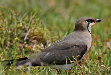 普通燕鸻[héng](拉丁学名:Glareola maldivarum)小型水边鸟类,体长20~28厘米。嘴短,基部较宽,尖端较窄而向下曲。翼尖长。尾黑色,呈叉状。夏羽上体褐色,下体白色。喉乳黄色,外缘黑色。颊、颈、胸黄褐色,腹白色。翼下覆羽棕红色,飞翔时极明显。嘴黑色,基部红色。冬羽和夏羽相似,但嘴基无红色,喉斑淡褐色,外缘黑线较浅淡,其内也无白缘。飞行和栖息姿势很像家燕。相似种灰燕鸻体型显著为小,上体较淡、灰色,尾为浅叉状,无喉斑。翼下覆羽不为棕红色而为黑色,具显著的白色翼后缘,无论飞翔或栖立时都易区别。 形态优雅,以小群至大群活动,性喧闹。与其他涉禽混群,栖于开阔地、沼泽地及稻田。善走,头不停点动。飞行优雅似燕,于空中捕捉昆虫。常见于飞机场。