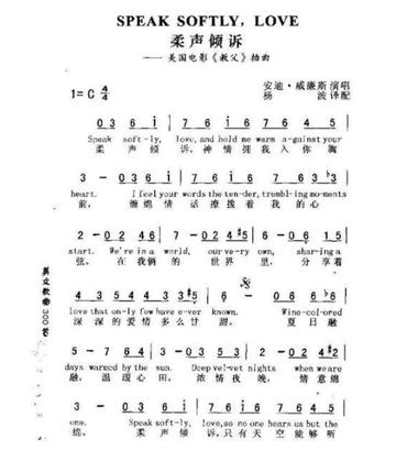 《柔声倾诉》尼诺·罗塔(Nino Rota)所写的一首歌,为美国电影《教父》主题曲。 尼诺·罗塔创作的《教父华尔兹》和《柔声倾诉》成为美国电影《教父》最具有标志性的元素。从旋律及格调来看,其主题音乐明显来自同一个主题,音乐与电影几乎浑然一体。变奏这一音乐手法达到了非凡的艺术效果。他对变奏与主题的把握和处理,树立了一座光辉的丰碑,为后人做出了表率。[1]