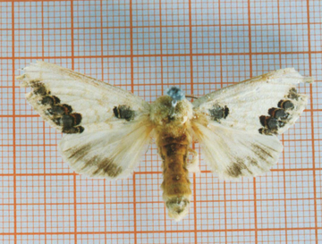 成虫体长22~25mm,翅展49~52mm,头胸部淡黄白色。腹背雄虫浅黄褐色,雌虫土黄色,末端均淡黄色。复眼黑色球形。触角黄褐色,丝状,雌虫触角背面白色,雄虫各节两侧均有微黄色茸毛。前翅银白色,在近基部生1长圆形斑,外缘有6个椭圆形斑,横列成带状,各斑内端灰黑色,外端茶褐色,中间有黄色弧线隔开;翅中部有淡黄色波浪状线4条;顶角上具两个 不明显的小黑点。后翅浅黄白色,近外缘处生1褐色横带,有些雌虫消失或不明显。[3]