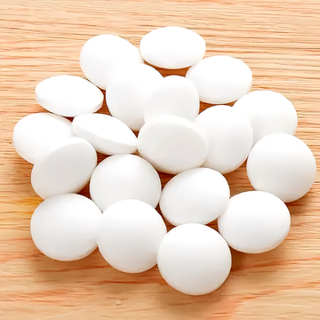 樟脑丸原料来自于天然樟树,将樟树的干、根、枝、叶经蒸馏制得樟脑油,再经过一系列工艺程序得来。含对二氯苯、萘的樟脑丸,属于农药类产品,一般用于工业品或农业品的防蛀,不宜用于生活类用品。大量实践证明,苯类物质对人体健康具有极大的危害性。因此,世界卫生组织已将其定为强烈的可能致癌物质。[1]樟脑丸分为天然樟脑丸与合成樟脑丸。天然的是光滑的呈无色或白色的晶体,气味清香,会浮于水中。用于防虫、防蛀、防霉的天然樟脑丸又被称为臭珠,原本是从樟树枝叶中提炼出的有芳香味的有机化合物。也用来制药、香料等,医药上用作强心药。合成樟脑丸是一种有机化合物,含有萘的樟脑丸大多呈白色,气味刺鼻难闻,且沉于水中。[2][3][4] 物理性质