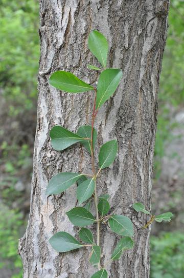 乔木,高达20米,胸径50厘米以上。树皮幼时灰绿色,老时暗灰色,沟裂;树冠近圆形。幼树小枝及萌枝有明显棱脊,常为红褐色,后变黄褐色,老树小枝圆形,细长而密,无毛。芽细长,先端长渐尖,褐色,有粘质。叶菱状卵形、菱状椭圆形或菱状倒卵形,长3-12厘米,宽2-8厘米,中部以上较宽,先端突急尖或渐尖,基部楔形、宽楔形或窄圆形,边,缘平整,细锯齿,无毛,上面淡绿色,下面灰绿或微白,无毛;叶柄圆筒形,长0.5-4厘米,黄绿色或带红色。雄花序长2-7厘米,花序轴无毛,苞片细条裂,雄蕊8-9(25);雌花序长2.5-6厘米;苞片淡绿色,裂片褐色,无毛,柱头2裂。果序长达15厘米;蒴[shuò]果小,2(3)瓣裂,无毛。花期3-5月,果期4-6月。