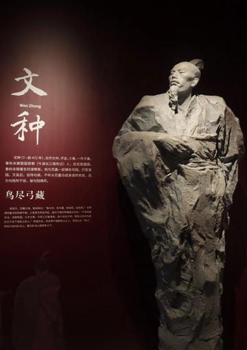 文种(?—公元前472年),也作文仲,字会、少禽,又作子禽,春秋末期楚之郢(今湖北江陵附近)人,任越国大夫。[3][4][6][7] 公元前511年,文种入越,成为越王勾践的谋臣。公元前494年,吴国击败越国后,勾践派遣文种议和。勾践在吴国为质期间,文种留守越国主持国政。公元前490年,勾践、范蠡君臣离吴返越。文种向勾践献计,贿赂吴国太宰伯嚭,鼓励吴国攻打齐国。公元前473年,越兵攻入吴都,包围了姑苏台,夫差自杀而亡,吴国灭亡。勾践灭吴后,文种自恃功高,不听范蠡功成身退的劝告,被勾践赐剑身亡。[6] 文种宣扬爱民思想,他死后,勾践将他葬在国都之西山(今浙江绍兴卧龙山,也称府山),后人为怀念文种,又将此山称为“种山”。[7][8] 人物生平