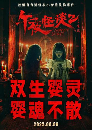 《午夜怪谈2》(又名:双生婴灵;英文名:Midnight StoryⅡ)是由朱迅执导,刘若林担任编剧,熊婧文、韩陌、姚致远、林羲汐、徐卓溢主演的惊悚恐怖电影,于2025年8月8日在中国大陆上映,共90分钟。[1][2] 《午夜怪谈2》改 编自1998年台湾红衣小女孩灵异事件,讲述了谢静从医院醒来后,背部出现对称血痂。回家后,她每夜见镜中双生女童互撕,溺毙时浴缸浮出带血双生胎儿。丈夫请来神婆,神婆用符咒贴满房间驱邪。暴雨夜,谢静腹腔爆裂,爬出的连体女婴各咬她半边心脏,血水在瓷砖上汇成双生咒纹的故事。[1]