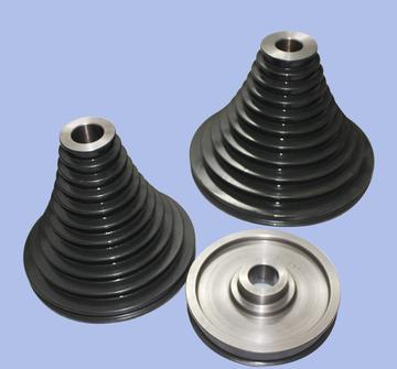 塔轮是一种具有多种直径的带轮,是用于改变转速用的传动件。通常两个塔轮配套使用。动力和运动由主动轴输入,通过带和塔轮装置由从动轴输出。当带所处的主动轮和从动轮直径相等时,实现等速传动。改变带的位置,当带处于主动轮直径小于从动轮直径位置时,实现减速传动;处于主动轮直径大于从动轮直径位置时,实现增速传动。塔轮传动可用于需要有级变速而功率较小的地方。由于塔轮传动装置尺寸较大,虽然结构简单,在机械传动中已很少采用。 塔轮传动