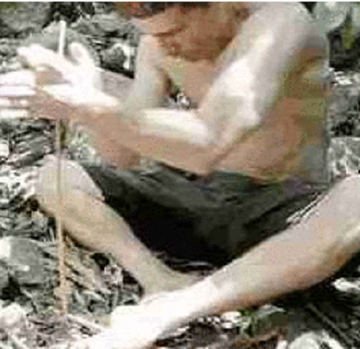 ,穿着裤衩,全凭一双手用找得到的天然材料:石头砍树、建造房屋构架,用藤蔓绑紧每根树枝,还用水混合泥土做墙面。