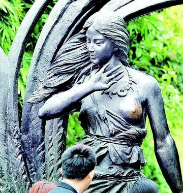 说亲”青铜雕塑上,大禹妻子的胸部被人摸得
