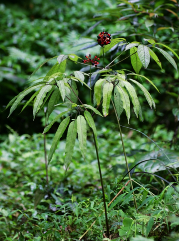 狭叶竹节参,别名竹根七、野三七、鸡头七、土三七、狭叶竹节七等,是五加科人参属植物狭叶竹节参Panax bipinnatifidus var. angustifolius的干燥根茎。[4][2][5][3]其味甘、微苦,性温。[3]具有散瘀止血,活血定痛,解毒消肿的功效。用于咯血,吐血,衄血,尿血,便血,崩漏,产后出血过多,瘀血腹痛,经闭,跌打瘀肿,外伤出血,疮疡肿毒,蛇伤。[6] 狭叶竹节参略呈圆柱形,稍弯曲,有的具肉质侧根。长5~22cm,直径0.8~2.5cm。表面黄色或黄褐色,粗糙,有致密的纵皱纹及根痕。节明显,节间长0.8~2cm,每节有1个凹陷的茎痕。质硬,断面黄白色至淡黄棕色,黄色点状维管束排列成环。[7]狭叶竹节参生于海拔2000~3000m的山中灌木丛中,[4]主要分布于中国四川、贵州、云南、西藏等地。[5] 来源