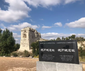 统万城遗址(英文名:Tongwancheng)是中国东晋十六国时期匈奴族后裔赫连勃勃建立的大夏政权的都城遗址,位于陕西省榆林市靖边县红墩界镇白城子村。其城墙因呈白色,被当地人俗称为“白城子”;又因系赫连勃勃所建,故亦被称为“赫连城”。[3][7][1]在中国历史文化遗产中,统万城遗址具有唯一性、真实性、至高性,[3]也是国家考古遗址公园和4A级旅游景区。[2] 统万城遗址是匈奴民族在人类历史长河中遗留下来的唯一一座都城遗址,已有近1600年历史。[a][3]统万城始建于夏国龙升七年(公元413年),竣工于公元418年,由汉奢延城改筑而成。[8]后来在北魏太武皇帝拓跋焘一统北方期间,统万城被攻克,从此设置为统万军镇。[7]统万城遗址的发现,对于研究十六国时期的文化以及当地的生态环境变迁,提供了重要的实物资料。[9]1992年统万城遗址被公布为省级重点文物保护单位,1996年统万城被列为全国重点文物保护单位。[10]2012年11月,统万城遗址被列入中国世界文化遗产预备名单。[11][10]2023年4月18日,统万城遗址入选第四批国家考古遗址公园。[12]2023年6月6日,统万城国家考古遗址公园正式开园。[13]2026年1月16日,统万城遗址入选2025年度陕西六大考古新发现。[14]同日,陕西省考古研究院对外公布统万城遗址发现了大夏独特的夯筑工艺,即“交错叠夯”技术。[15]统万城通过“文化+”模式焕发新生,累计接待游客超20万人次,旅游综合收入约600万元。[2][b] 统万城遗址的遗存分布范围约9.55平方公里,整座城池分为外郭城和内城,其中内城又分为西城和东城。外郭城呈曲尺形,周长13865.4米;西城是宫城所在区域,周长2470米;东城相当于西城的外城,周长2566米。城内遗存的墩台、马面、城垣、瓮城、城壕等,真实完整地反映了大夏国在城市规划、城防体系、建筑设计、材料应用等方面的智慧。[3][6]统万城现存遗迹是古代北方游牧文化和中原农耕文化交流与融合的重要实证,当前已建成遗址博物馆、考古工作站、游客服务站、旅游环线等设施。[16] 命名