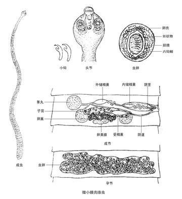 为小型绦虫,成虫体长5~80mm(平均20mm),宽0.5~1mm。头节呈球形,直径0.13~0.4mm,具有4个吸盘和1个短而圆、可自由伸缩的顶突。顶突上有20~30个小钩,排成一圈。颈部较长而纤细。链体由100~200个节片组成,最多时可达近千个节片。所有节片均宽大于长并由前向后逐渐增大,孕节达0.15~0.30mm×0.8~1.0mm,各节片生殖孔都位于虫体同侧。成节有3个较大的圆球形睾丸,横列在节片中部,贮精囊较发达。卵巢呈分叶状,位于节片中央。卵黄腺椭圆形,在卵巢后方的腹面。子宫呈袋状,其中充满虫卵并占据整个节片。
