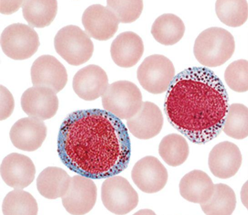 颗粒较原始粒细胞稍粗糙,呈均匀大沙粒体,