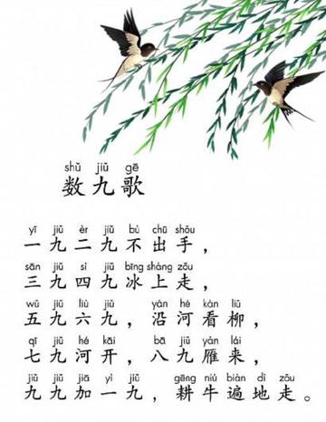 九九歌是中国传统农民歌谣。[1][6]别名“数九”又称“冬九九”,是中国冬季一种民间节气。描述从冬至开始每九天为一“九”,共数八十一天,反映天气由冷转暖的过程。远在公元前的春秋战国时代,九九歌就已经被人们广泛使用。在当时的许多著作中,都有关于九九 歌的记载。[1][7] “数九”习俗起源甚古,但有文字记载的史籍,是南北朝时期梁国人宗懔写的《荆楚岁时记》,“俗用冬至日数及九九八十一,为寒尽。”广为流传的“九九消寒歌”说:“一九二九不出手,三九四九冰上走,五九六九看杨柳,七九河开,八九雁来,九九加一九,耕牛遍地走。”由于中国地域广阔,各地气候寒暖不一,各地的九九歌也有所区别[8][9]。