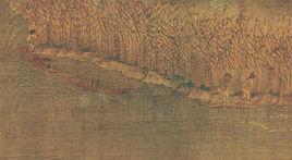 初冬渔民和旅行的生活情况,绘景画人均积极传神。图中树石笔法老硬,水纹用笔尖劲流利,天空用白粉弹作