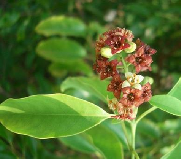 檀香(Santalum album L.):为檀香科檀香属植物,常绿小乔木,高约10米;枝圆柱状,带灰褐色,具条纹,有多数皮孔和半圆形的叶痕;小枝细长,淡绿色,节间稍肿大,具寄生根。原产于太平洋岛屿,主要以印度栽培最多,中国广东、台湾有栽培,全年可采。[5] 檀香树之所以被称为“黄金之树”,是因为它全身几乎都是宝,而且每个部分的经济价值都很高。檀香木的心材是名贵的中药。檀香树根部、主干碎材可以提炼精油,檀香精油俗称“液体黄金”。檀香树冠的幼枝和生长过程中修剪下的部分枝条是高档制香制品厂争相收购的原材料,并为雕刻工艺的良材。