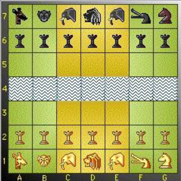 七格长的横行作为河界把棋盘分两半,除河界外的中间三行称为九宫,也被称为宫殿,用以容纳狮子。