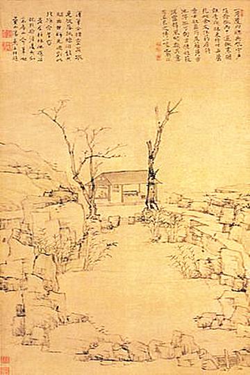 弘仁(1610—1664),明末清初画家。本姓江,名韬,字六奇,一作名舫,字鸥盟。安徽省歙县人。法名弘仁,号渐江学人、浙江僧,又号无智。后人称他为梅花古衲。此图所绘为弘仁的诗友香士的书斋。简陋的茅舍与阵设衬托出主人品格的高洁与孤傲,虚堂静敞,门外二树枯槎直指苍穹,一湾清浅的溪流江集成潭,环绕在高低错落的岩石间,水波不兴,犹如主人不逐名利的平淡心境。石边,水际短荻丛生,清润可爱,为这幽寂的贫士生活增添了几许生趣。