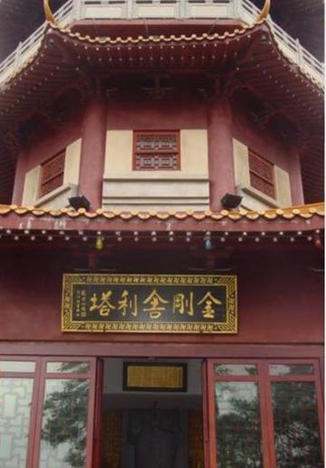 金刚舍利塔位于南台寺左侧的瑞应峰。塔高48米,九层八角,石混结构,沿内壁有256级旋梯可上至顶层。一层阁楼中,供奉着5.4米高的佛祖释迦牟尼立像,二至八层分别供奉大智文殊师利菩萨、大行普贤王菩萨、大悲观世音菩萨、大愿地藏王菩萨、药师琉璃光王佛、极乐世界阿弥陀佛、华严教主毗卢遮那佛,第九层安奉佛的舍利,以铁门锁闭,轻易不予示人。塔顶盖黄琉璃,八角飞翘。各层沿外壁有回廊,可供远眺。塔四周和围墙上,置有佛祖故事连环壁画、五百罗汉图、功德碑、诗词碑廊等,精致素雅,堪称中南五省最为宏伟壮丽的塔刹。 金刚舍利塔,为砖石结构的楼阁式,红色的外墙,挺 拔高大,古朴雄浑。来到塔脚,举目仰望,金刚舍利塔似擎天大柱顶天立地。