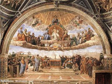 《圣礼之争》是一半圆形庞大构图。天上的人群和地下的人群均排列成弧形,地面上画的是人数众多的教会领袖和高级僧侣,天上画的是神的三位一体:圣父上帝、圣子耶稣、圣灵鸽子,12圣徒围成半圆坐在耶酥的两边。整个画面人物虽多,但多而不乱,层次分明,神态各异的人物活动都是紧密相联,互相呼应。 作品简介