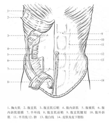 腹壁上界为剑突和肋缘;下界为耻骨联合、腹股沟韧带及髂嵴;外侧界从肋缘垂直下行至髂嵴最高点之连线。由剑突向下过脐到耻骨联合的正中线为腹白线,是两侧腹直肌鞘的汇合线。半月线由腹直肌外缘形成,以第9肋软骨前端伸展至耻骨结节,呈略向外凸的弧度。两侧髂前上棘连线与正中线相交处为脐。[1]