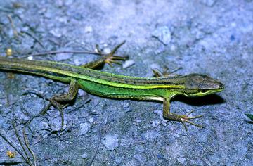 北草蜥(Takydromus septentrionalis),又名中国草蜥,是蜥蜴科、草蜥属的著名爬行动物[1]。北草蜥体瘦长,头体长62~70毫米;尾长180~245毫米,尾长约为头体长的3倍,头部具有大的对称形鳞片,没有上鼻鳞。额鼻鳞为1枚,前端钝圆,后端呈锐角。前额鳞为1对,左右相切。额鳞为长五边形,上眶鳞为4对,第1对极小,呈颗粒状。顶间鳞为小菱形,与后方更小的枕鳞相邻。枕部被粒鳞,后方的鳞片逐渐变大并起棱,颈部有排列不规则的棱鳞列。背部有6行大棱鳞列,中央2行逐渐变小,最后消失,有些个体达到荐部才消失。腹鳞为大八列,起强棱。体侧有2至3行较腹鳞明显小的棱鳞列,余部被粒鳞。四肢背面有棱鳞,腹面鳞片较光滑,肛前鳞为1枚,呈倒梯形,鼠蹊窝位于股基部。泄殖腔后方的鳞片变大起棱,尾鳞起强棱,环尾中部有14列鳞片。掌、跖[zhí]面被大小较一致的大粒鳞。生活时,北草蜥的体色变化较大,体背草绿色、棕绿色或棕色,体腹黄绿色或灰白色。雄体的背侧有一纵纹,体侧有深色斑。浸泡标本时,绿色变为淡蓝色。北草蜥主要生活在山区和丘陵的荒地、农田、茶叶园、路边、乱石堆、灌木丛及草丛中。它以各种无脊椎动物为食,包括蝗虫、老鼠妇、蛾类幼虫等。北草蜥的生存海拔范围为436~1700米[2][3][4]