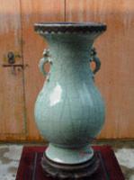 清代早期的三位皇帝康熙、雍正、乾隆都十分喜爱宋代的官窑瓷器,特别是单色釉器。清雍正仿哥釉盘口双螭龙耳瓶是一件雍正时期民窑烧造的仿宋代哥窑器。整个器型潇洒大方,釉面肥厚莹润,开片自然,呈金丝铁线,韵味十足。两条螭龙盘伏在瓶颈处,生动活泼,给整器增添了动感。雍正、乾隆朝该类瓷器的分别是:雍正朝器器身修长,瓶腹微敛,釉面肥厚,大开片,开片自然。乾隆朝器器身显得粗壮,瓶腹外鼓,釉面相对较为稀薄,通常开细纹片。两朝器同为沙底,但雍正朝器沙底细,全底上护胎釉;乾隆朝器沙底较粗,通常在圈足部分上护胎釉。