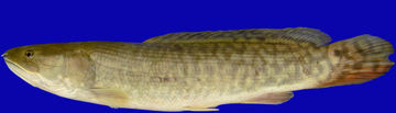 弓鳍鱼(拉丁学名:Amia calva),别名狗鱼、棉花鱼、黑鱼等,是弓鳍鱼科唯一已知的现存物种,[2][4][a][3]被称为“活化石”,[6]由现代生物分类学鼻祖林奈在1766年命名。[4]弓鳍鱼的自然分布范围北起加拿大的圣劳伦斯河、渥太华河与尚普兰湖,向西延伸至五大湖区(包括乔治亚湾),并涵盖安大略省的尼皮辛湖和锡姆科湖。[6]弓鳍鱼多栖息于低地回水区、牛轭湖及植被丰茂的清澈溪流,可适应浑浊与高温水体,成鱼日间居深水,夜行及繁殖期转至浅水。[6] 弓鳍鱼体型修长,成年个体体长约300毫米,体重约700克,其体长可达体高的5倍左右。体色呈金黄色,头部通常有三条黑色横纹。其鳍型适应缓流环境,胸鳍呈叶状,背鳍长,臀鳍短,尾鳍为外凸的圆形,根部上侧有一形似眼睛的黑色圆斑,具迷惑天敌的作用。其游泳速度较慢,前进主要依靠长背鳍的竖直摆动提供动力。上、下颌骨、前颌骨及犁骨均具齿,口缘齿尖锐细长且内弯,适于抓取撕裂猎物,而口内部齿则相对短小尖锐,用于碾压切割食物。[4] 弓鳍鱼以昆虫及其幼虫、介形虫、浮游动植物等为食。[3][4]其春季繁殖,雄鱼筑巢引雌鱼产卵,之后守护受精卵及幼鱼,[3][4]通常寿命最长约12年,偶有记录可达30年。[4]2011年,弓鳍鱼被列入《世界自然保护联盟(IUCN)濒危物种红色名录》,并被评估为无危(LC)物种。[7] 名称由来