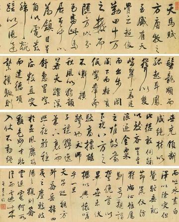 ★天马者,乡乃伊犁,野近昆仑;凌虚逐景,追电驰云。骨腾飞而性雄烈,神萧逸而志绝尘。瀚海沙迷,非终老于槽枥;瑶池草茂,时奋蹄于塞门。浩发撼岳之清啸,上逾接天之彩雯。气超龙沙之万里,飒沓八荒之丹岑。临风而肘腋栩栩,敲蹄而瘦骨棱棱。眺苍穹,山风濯骨;穷天阿,雪岭娱神。其形也:鼻开雾窍,耳耸剑令。牙锋目润,背短腑平。其色也:黑鬃渡鸦,白骝[liú]烁银,青栗沉黛,赤火灼温。皮相者,惟见牝[pìn]牡;知神者,鉴其骨筋。思远八极,羡其遐迩无羁;云痕一抹,任其逍遥玉津。飘风骤雨,若隐若灭;惊矫纵耸,或孤或群。历天西而不蹶,渡关山而无惊。曾驱养于大圣,或腾骧于天庭。出月支窟,造父难驭;越无影隙,伯乐何评?伐大宛,将军索骥;服贰师,武帝耀兵。乌江岸,乌骓不弃;檀溪外,的卢蹄轻。走单骑而赤兔得主;修正果而白马驮经。突锋冒镝;通灵而垂缰义伏,守诚尽忠,不语而贴脸相亲。逍遥无极,似天龙之所化;纵横野荒,非帝王之敢轻。鬃毛烈烈兮,霜蹄砰砰;泥淖难陷兮,荆芒深深。骨气亭伟兮,曹霸知态;追风汗血兮,韩干摹魂。