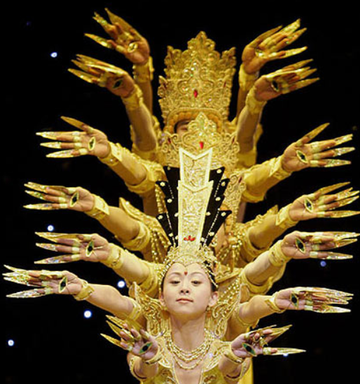《千手观音》(Thousand Hands Guan Yin),是编导张继刚根据佛教千手观音的形象,采用中国古典舞中敦煌舞的动作素材,为中国残疾人艺术团打造的女子群舞作品。该作品在手臂和队形的变化上做了设计,并用叠体的方式,将观音手臂舞蹈进行横向变体,从而将观音的千手展现出来。[2][1]