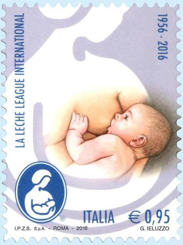2016年10月17日,意大利邮政发行一枚邮票,纪念国际母乳会成立六十周年。国际母乳会由七位女士于1956年建立,她们致力于使母乳喂养更容易,并让母亲和孩子都从中获益。国际母乳会的的宗旨是帮助世界范围内的母亲,通过“母亲对母亲”的帮助支持、鼓励、信息提供和培训进行母乳喂养,促进人们更好地认识母乳喂养是孩子和母亲健康成长与发展的一个重要因素。国际母乳会活跃于世界70多个国家和地区。每个月,7000多名通过官方认可的哺乳辅导以志愿者身份帮助30多万名母亲。国际母乳会是非政府组织,为联合国儿童基金会提供咨询,与世界卫生组织保持官方联系,已于美国国际开发署注册为私营志愿组织,是通过官方认可的“美国健康妈妈健康宝宝联盟”的成员、“儿童生存协作与资源团体”的成员、以及“国际母乳喂养行动联盟”的创始成员。这枚邮票由GaetanoIeluzzo设计,面值为0.95欧元。